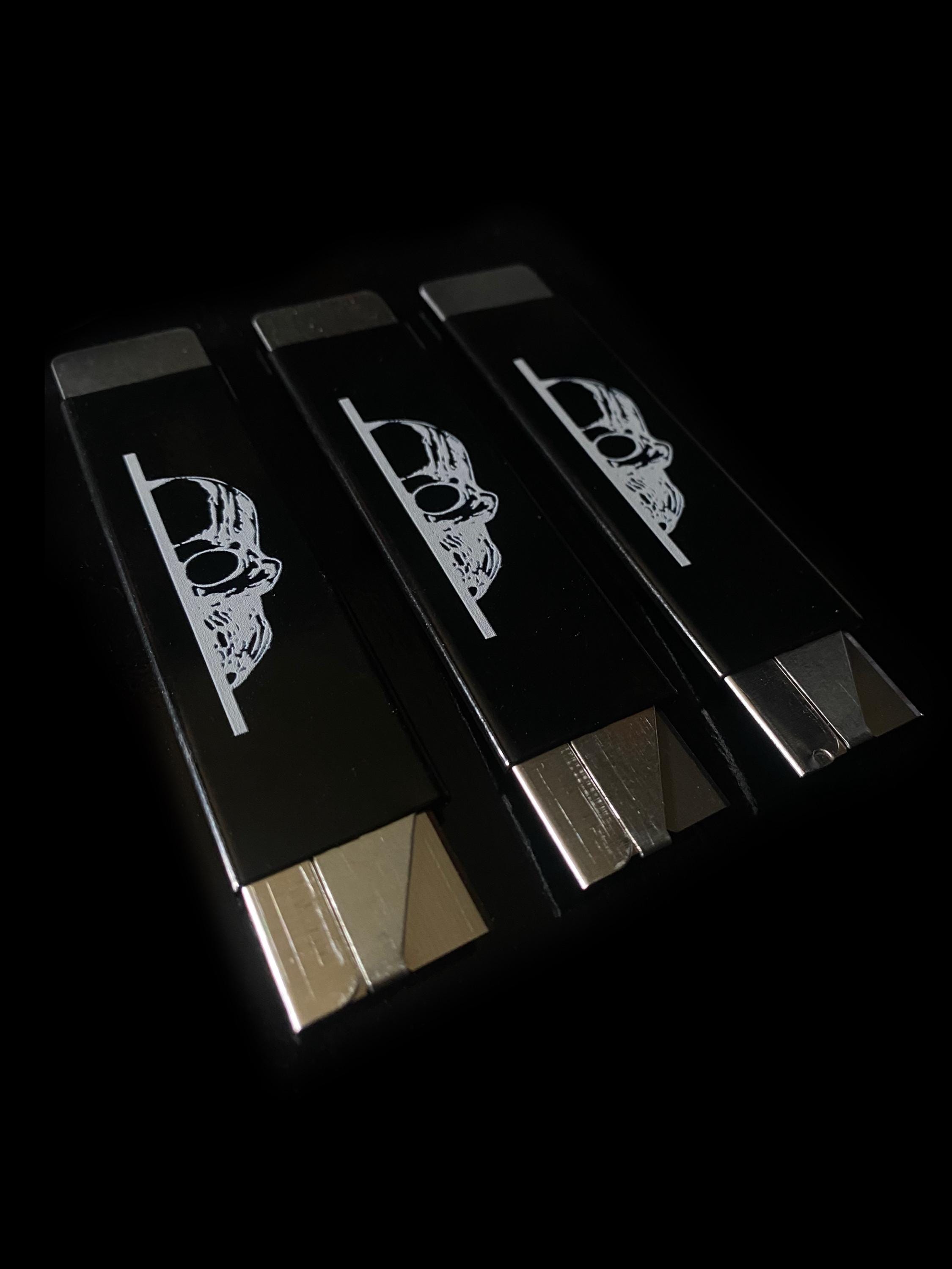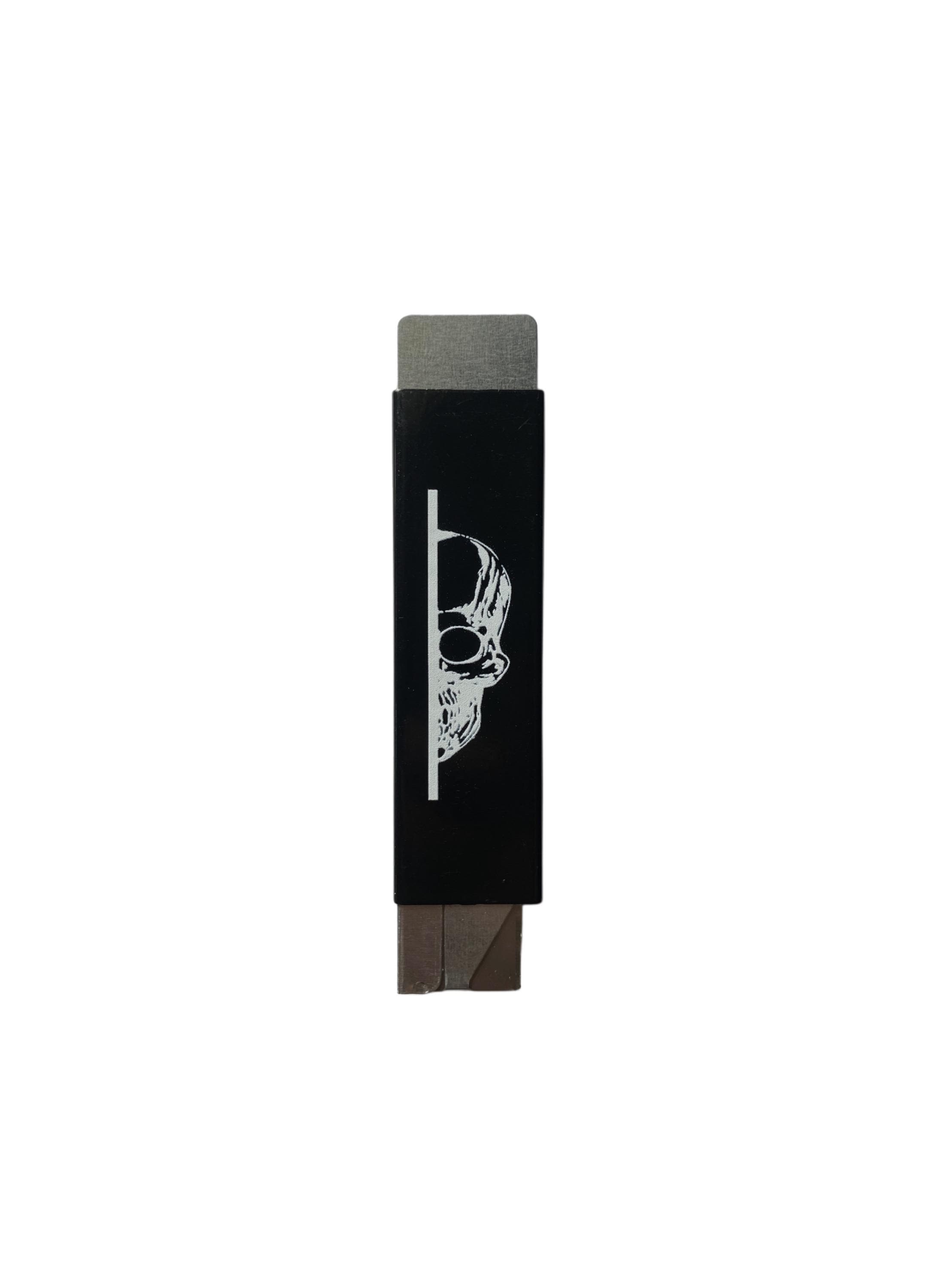 Typical boxcutter with no overwhelming magical qualities. No surrender to any cardboard.4” x 1” when closed🏴☠️Black cover w/ logo & silver metalHappy slicing 🥷🏼